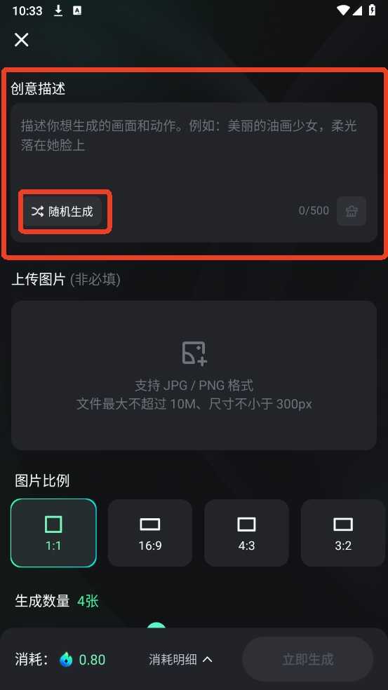 2、输入(enter)描述,支持中英输入(enter),字数限制(xianzhi)在500字以内,如果暂时没有灵感可以随机生成。提示词最好说明(illustrate)具体的要求,丰富且清晰。公式:主体+行为(Behavior)、特征、情景、情感+时(shi)间+环境+动作(dongzuo)行为(Behavior)+质感、构图、色调、细节。