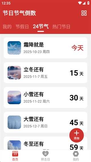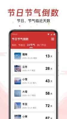 节日节气倒数(节气日历app哪个好)用户可以随时添加一些重要的日子,软件就会在相应的时间内进行提醒,防止用户忘记,同时还可以帮助用户进行各种日历查询以及二十四节气查询,24节气中倒数第三个非常的方便好用,界面简洁大方,喜欢可以往下继续看。