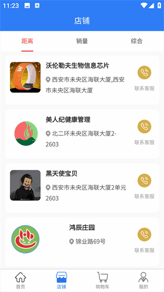 3、进入店铺模块,能看到附近的店铺信息,有问题can随时联系客服。