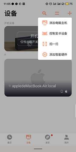 2、选择(xuanze)底端“设备(shebei)”选项,点击右上角的“+”,可以选择(xuanze)添加电脑主机、控製安卓设备(shebei)或者添加智能硬件。