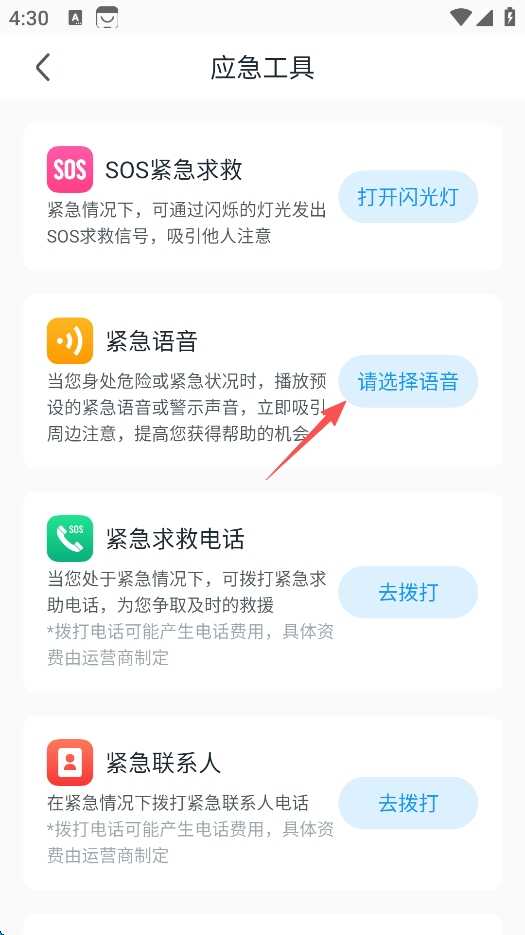2、点击“紧急语(yu)音”右侧的“请选择语(yu)音”。