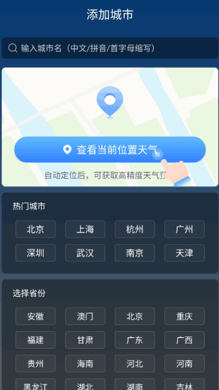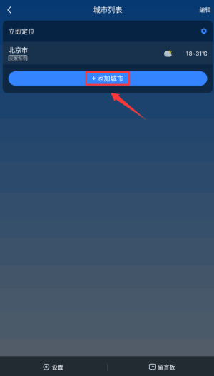 2、?添加城市?:在首页点击右上角,进入(Enter)城市列表,点击添加城市,通过搜索或定位选择想添加的城市。