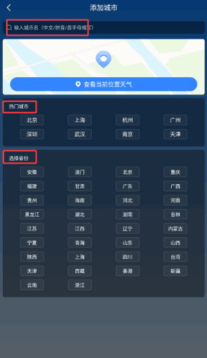 3、来到添加城市界面,可以直接搜索要添加的城市,下面也有热门城市可选择。