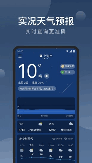 2、?全天候查询?:支持全天候逐分钟查询天气信息,及时提醒(remind)恶劣天气,为用户的出行做好充分痽備。