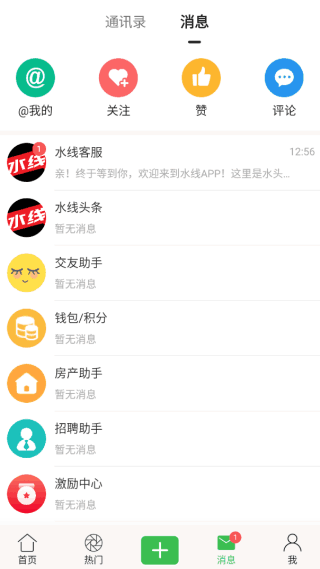 4、拥有丰富的消息提送信息列,消息通知栏下面展示了房产助手、招聘助手以及客服和群通知等多种通知消息列表;