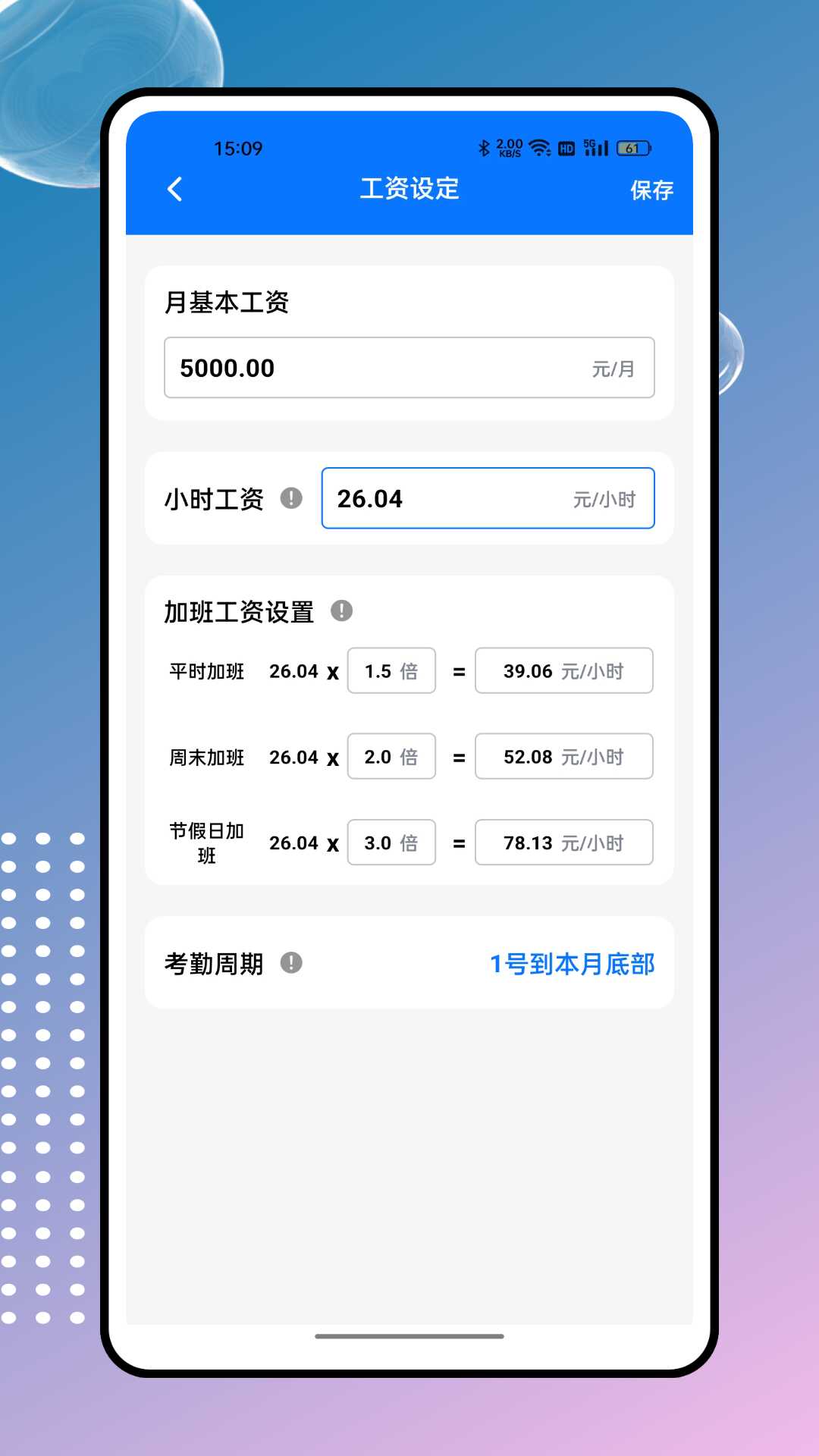 4. 在工资计算功能中,软件会根据已记(ji)录的加班时间自(zi)动(dong)计算出应得的工资。