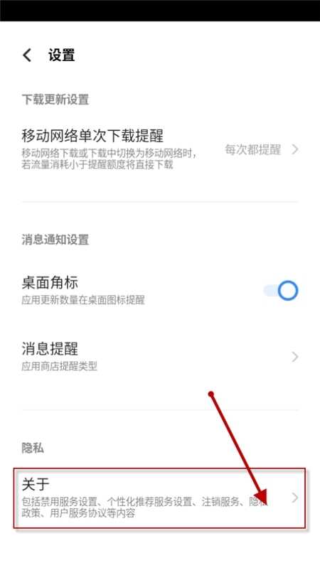 3、在设置界(jie)面中,点击关于,进入服务设置界(jie)面。