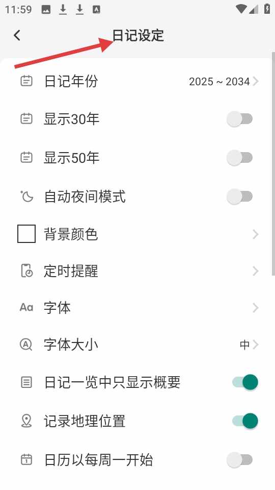 4、日记设置页面可选择日记年份范围,设置显示年限、自动夜间模式等,还能调整背景(background)颜色、字体等个性化选项(xuanxiang)。