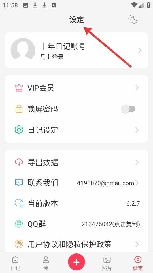 3、设置页面可登录十年日记账号,管理VIP会员、设置锁屏密码等,提供联系邮箱QQ群及版本信息。