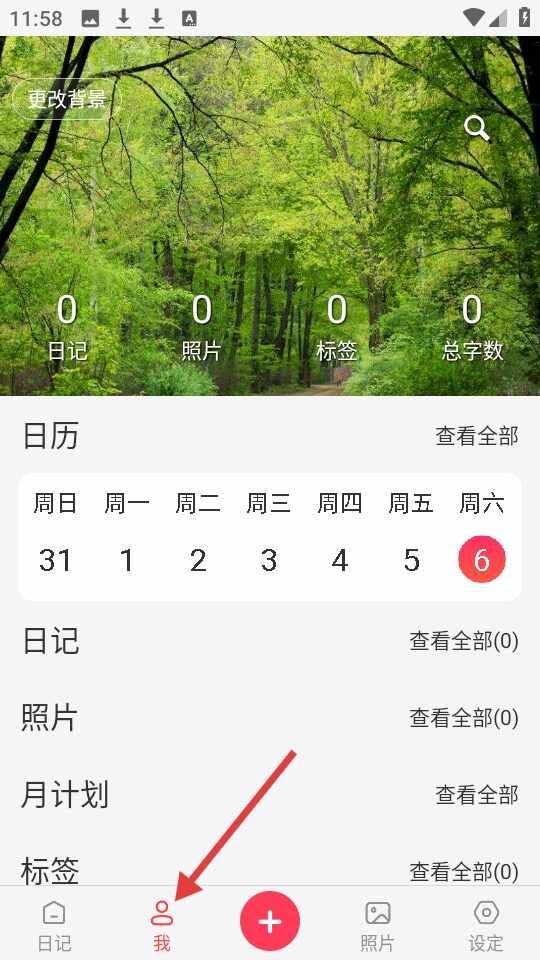 2、我页面以森林图为背景(background)统计日记、照片等数据,集成日历功能,可快速查看日记照片等项目内容。