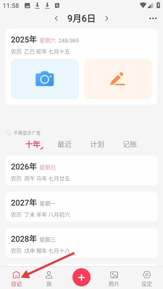 1、日记界面呈现当前日期及农历信息,设有记录入口下方十年等标签方便切换查看不同时段记录。