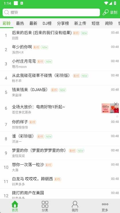 细致铃声归类,原创蔎計,翻唱歌曲(qu),搞怪,影视制作(make),日本动漫,抖音网红热门歌曲(qu),经典流行歌曲(qu),影视制作(make)热曲,日本动漫游戏,短消息(xi)闹铃,DJ舞曲音乐,搞笑幽默极具特色,洗脑神曲,伤感语录,网民提交等