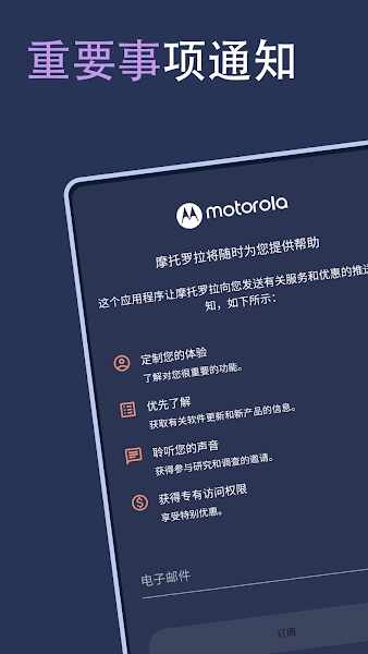 摩托罗拉通知(摩托罗拉通知APP)旨在为用户提供更好的产品体验。在这里,你将及时获得用于改进体验的提示,向您发送有关服务和优惠的推送,摩托罗拉通知接收第一手的发布资料,自定义通知提醒方式,接下来就让我们一起了解一下吧。