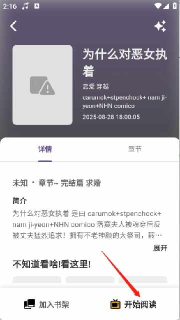 5、点击心仪的漫画进入详情页,查看简介、章节列表与用户评价,确认后点击【开始阅读】按钮。