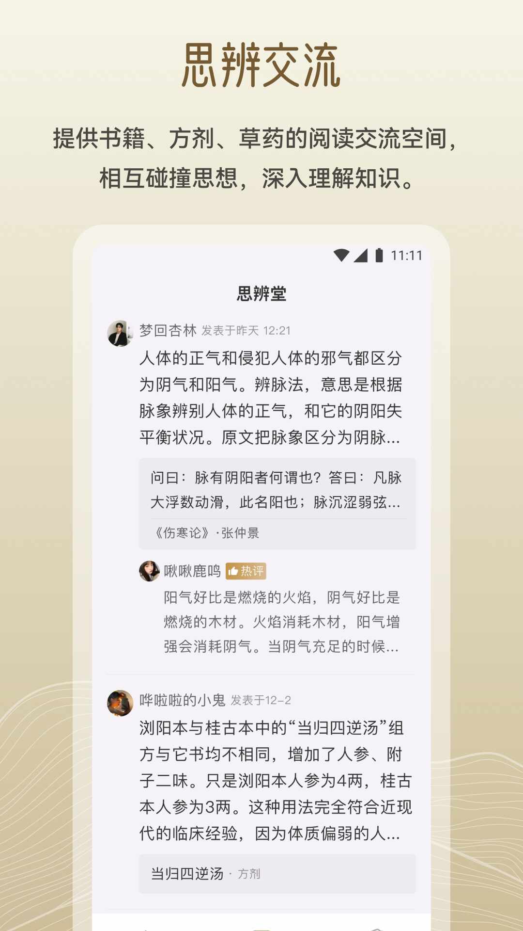 5、在“思辨堂”中用户将能够与众多(numerous)从事中医相关用户交流相关内容。