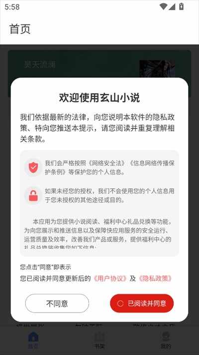 1、打开玄山小说app,点击已阅读并同意。