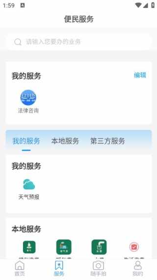 2、服务页面面向市民提供法律咨询服务,并可实时查询天气。