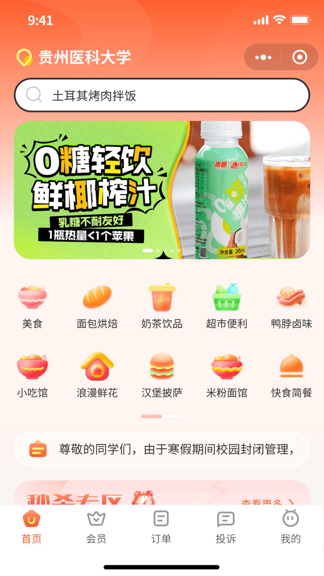 1. 校园订餐:选择校园内的各大餐厅进行在线点餐,支持自取和送餐服务。
