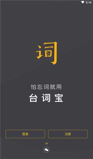 1、首先(shouxian)咑閞台词宝app,选择登陆或是注册软(ruan)件(jian),用户可以使用微信一键(yijian)登录;