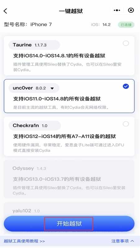 2、打开一键越狱功能,选择支持的越狱工具(可勾选的为支持当前(current)设备的越狱工具),然后点击“开始越狱”。