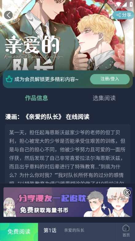 4、进(jin)入(ru)漫画详情页,点击(ji)"免费阅读(du)"即可(ke)观看。