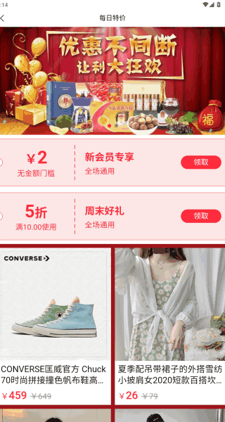 2、点击每日特价,看一看有没有打折的商(shang)品(pin),还有无金额门槛卷和打折卷领取。