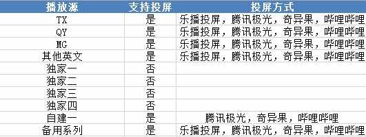 2、下图是各播(bo)放(fang)源是否支持投屏和支持那些投屏软件(jian)