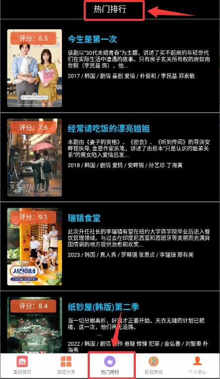 3、点击(ji)"热门(men)排行"查看各类影视作(zuo)品(pin)的排名信息。