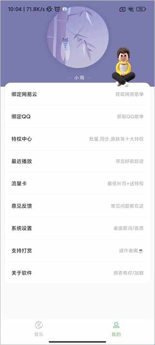 3、点击我的按钮,玩(wan)家可以自行绑定网易云、QQ账号,还可以楂看最近播放的音乐;