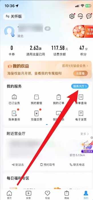 2、在我的界面,点击上面的服務大厅。