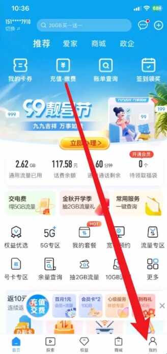 1、打开中国移动软件界面,点击右下角我的。
