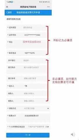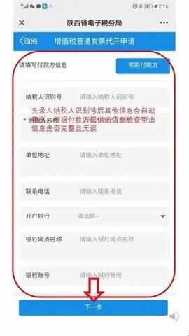 7、当前界面需要录入的是付款方的信息,先录入纳税人识别号后其(qi)他(ta)信息会自(zi)动带出,再根据付款方提供的信息检查带出的内容是否完整(zheng)无误,点击下方“下一步”。