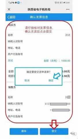 19、请再次确认发票信息,确认无误后点击最下方“提交”,弹出窗口点击“确定”。