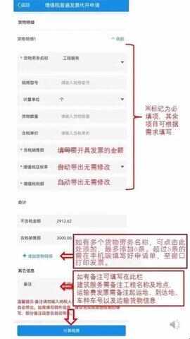10、界面再次回到代开申请界面,您可以继续完善货物明细1下方的详细信息,其中红色星号标记为必填项,其余项目自愿填写。如果您一张发票中需要△开具多个项目,可以点击中间蓝色“添加货物明细”字样添加项目,最多可添加8项。