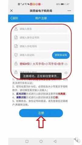 4、实名验证成功后进(jin)入(ru)注册界面,输入红色方框内的所有信息,其中密码要求8位,包括1位大写字母、1位小写字母及至少6位数字。信息输入完整(zheng)后点击下方“注册”。