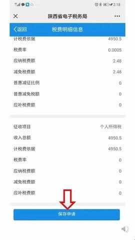 18、请仔细查看税费信息,确认无误后点击最下方“保存申请”。