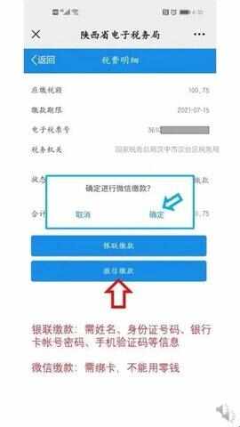 22、您可以选择银联缴款或者微信缴款,银联缴款需掌握付款银行卡号码、密码、手(shou)机(ji)验证码三项信息,微信缴款需提前绑定银行卡进行支付,不能使用微信零钱支付,我们来演示一下微信支付流程,请您点击“微信缴款”,弹出窗口点击“确定”。