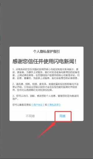 1、启动闪电新闻应用,于隐私指引页面点击同意授权条款。