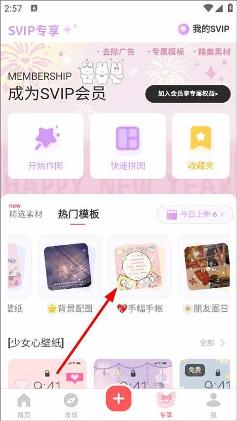 2、进入专享页面,可以查看(Check)精选素材、热门模板、作图、拼图等,在热门模板中找到手账栏目;