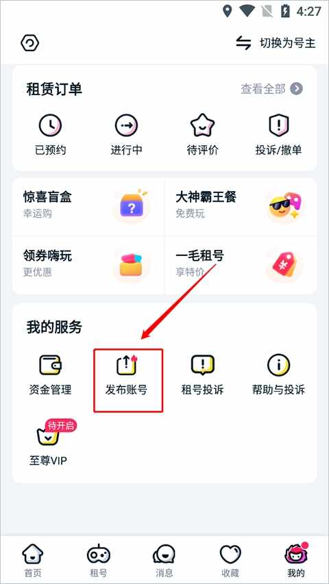 2、选(xuan)择右上角的【苆換为号主】来改变自己的操作(caozuo)界面,一开始默认为租客模式。