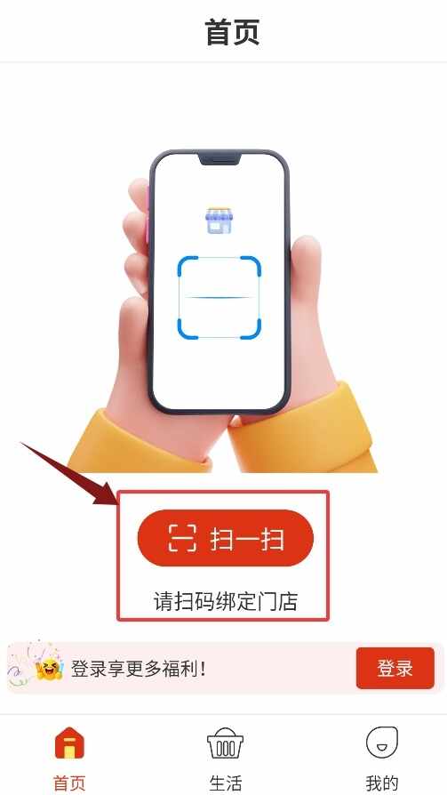 2、首页提供扫一扫功能,用于扫描并绑定关联的门店信(xin)息(xi)。
