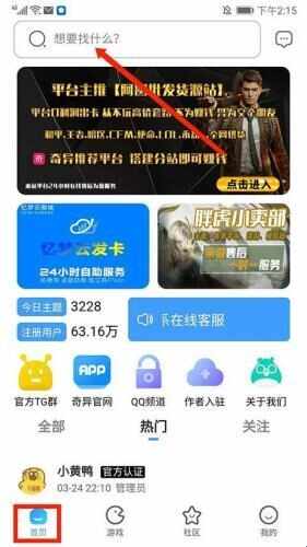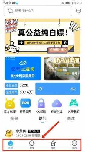 1、打开奇异社区,进入应用主界面,可看(kan)到分为【首页】、【游戏】、【社区】和【我的】栏目。