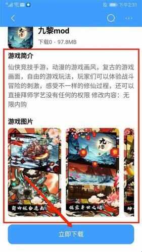 5、这(zhe)里(li)以【九黎mod】为例,可看(kan)到相关游戏简介、mod说明和游戏图片,选择【立即下载】即可下载mod资源了。