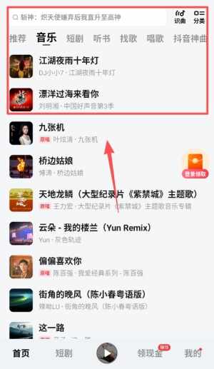 2、在主界面选择音乐板块或通过搜索(sousuo)找到想听的歌曲(gequ)所有歌曲(gequ)均可免费畅听无时长限制(zhi)过程中会累积收益(shouyi)。