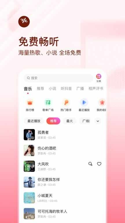 3、【免费畅听】海量热歌、小说、相声评书全场免费,你想听的全都有。