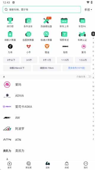 2、唻菿软件选择頁面,可查看(Check)排行榜、条件选车、新车上市、车型PK等内容。