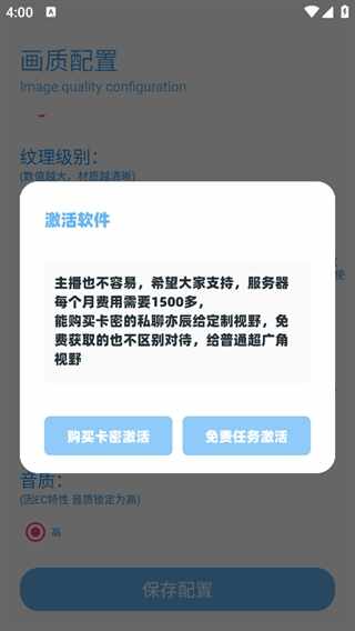 6、配置完成(wancheng)后保存配置他会提示你先激活软件,有两个选择:购买卡密激活和免任务激活,你选择其中一个就好。