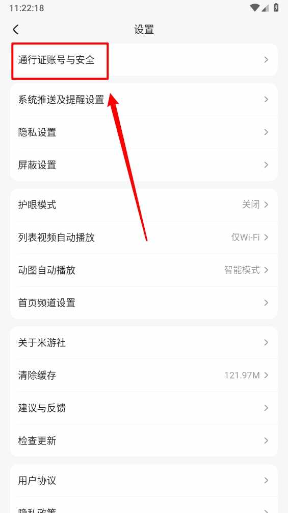 4、琎叺设置页面(mian)点击"通行证账号与安全(Safety)",如图。
