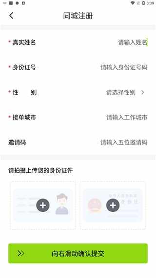 3、按要求填写姓名、证件号码、性别、接单城市,再拍摄上传身份证进行提交,审核通过即可进行接单。