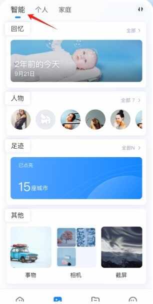 1、点击智能页面呈现多样分类,有回忆、人物、足迹等板块,记录生活点滴,展现智能管理生活的便捷。